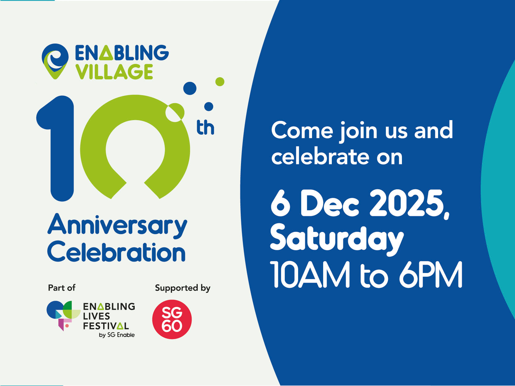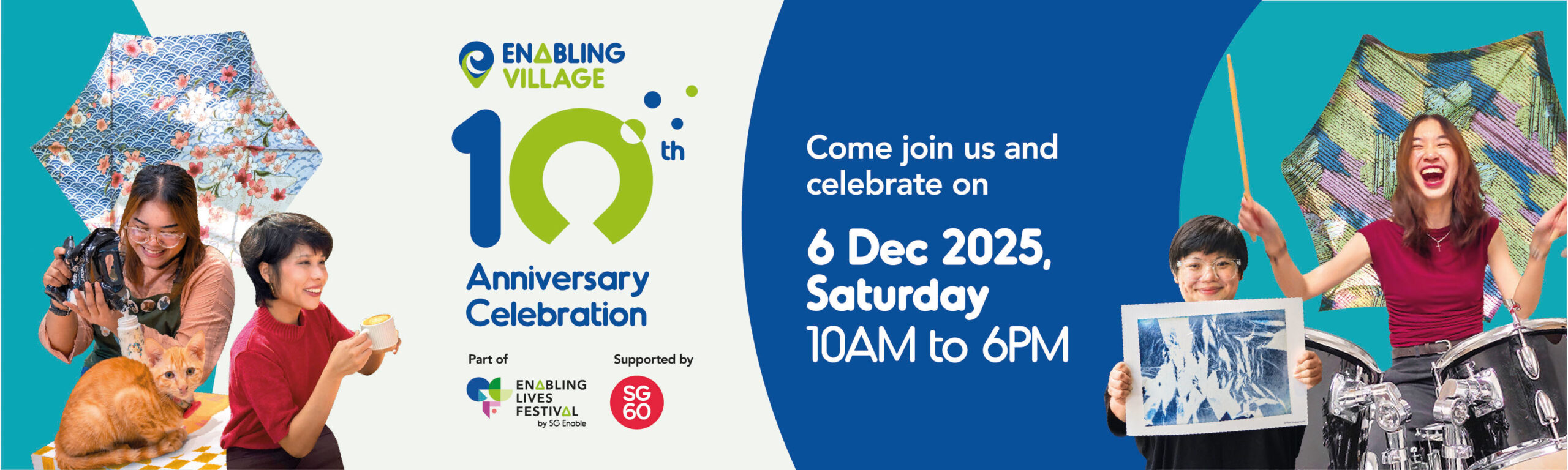 Enabling Village turns 10! Join us in celebrating a decade of inclusion and community as part of the Enabling Lives Festival. Enjoy a vibrant line-up of activities from the i’mable Collective Market and interactive workshops held by our partners to tours and performances by talented persons with disabilities. With exclusive promotions and plenty of fun in store, it’s a joyous occasion for everyone to connect and have a great time together!